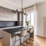 Alle spalle del divano si trova invece la cucina, posta al centro del progetto di ristrutturazione, come già precisato. È così che si impone infatti come elemento centrale con mobili tra il tortora e il grigio chiaro, perfettamente allineati con le ultime tendenze che vedono il ritorno del marrone in tutte le sue declinazioni, come dimostra l’elezione di Mocha Mousse a Colore dell’anno 2025 da parte dell’Istituto Pantone.