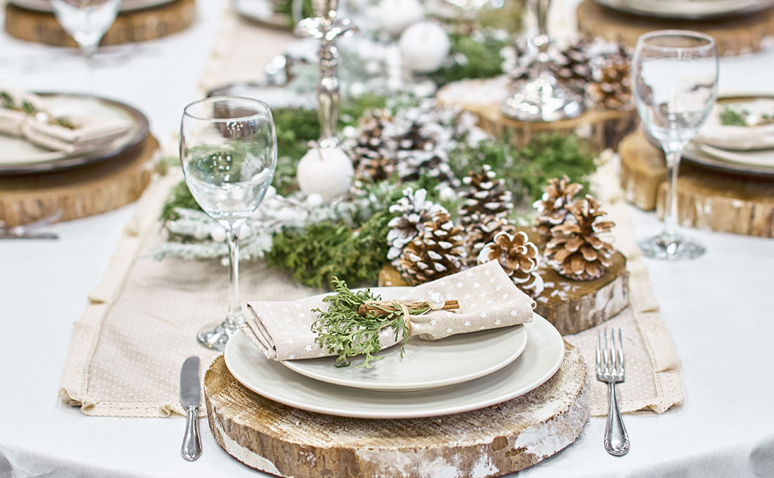 Il total white di biancherie e stoviglie, impreziosito con dettagli bronzo, oro o argento, è generalmente un buon passepartout. Un tocco di classe è dato dalla scelta di tovaglie, runner e presine realizzate con tessuti naturali – e non sintetici – abbinati a tovaglioli in tinta e nello stesso materiale, piegati in forma triangolare o rettangolare e collocati a destra del piatto o sopra lo stesso.