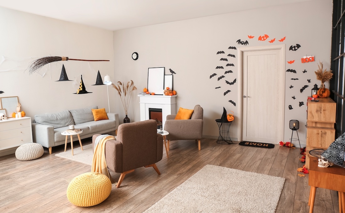 Anche se lo spazio riservato all’ingresso potrebbe essere più contenuto rispetto agli altri ambienti, merita anch’esso di essere decorato a tema Halloween in modo da rendere subito chiara l’atmosfera che si respira in casa! Un’idea salvaspazio è quella di sfruttare la verticalità della stanza, concentrando quindi le decorazioni sulle pareti, sulle mensole, sui mobili pensili. Ipotizzando che nel tuo ingresso ci sia poi la classica consolle, è lei che diventerà il punto focale di questa zona. Posiziona piccoli teschi, candele consumate, zucche di varie dimensioni; appendi ragnatele finte e finti ragnetti, scope e cappelli da strega; recupera stencil a tema e decora i muri. Se una volta varcata la soglia di casa, si entra invece direttamente nella zona giorno, oltre ai precedenti consigli che valgono anche per il salotto (dove puoi pensare di acquistare cuscini a tema per il divano) o per la sala da pranzo, abbi cura di decorare le finestre per ottenere un duplice vantaggio: attirano l’attenzione all’interno e sono (più) visibili all’esterno. Spazio, quindi, alla creatività: cartoncini sagomati, decalcomanie, stickers o stencil – comprati o, diversamente, realizzati artigianalmente – da appendere o da attaccare saranno i tuoi alleati per creare suggestivi disegni sulle finestre (ma anche su porte e pareti). Infine, che tu decida di allestire decorazioni ad hoc esternamente o internamente, è importante giocare con l’illuminazione per creare quanto più possibile atmosfere spettrali. Un’idea per il light design di Halloween è quella di installare temporaneamente luci gialle ed arancioni – i colori tipici della ricorrenza, insieme al nero – ai propri lampadari in modo da diffondere dentro e fuori casa una luce sinistra e in perfetto pendant con il clima di festa.