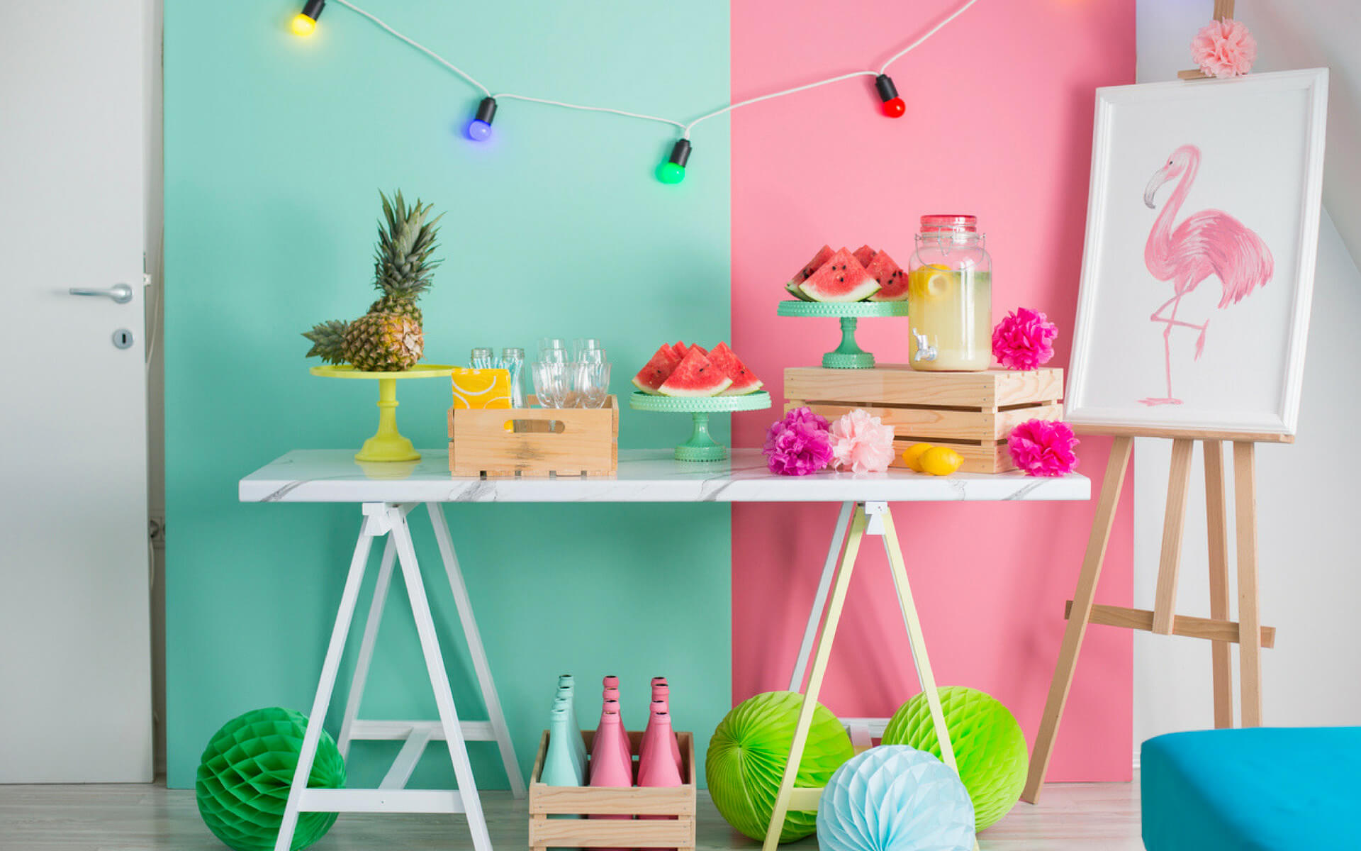 Grazie alle decorazioni più in voga del momento, voi e i vostri ospiti potreste godervi i tropici e sentirvi in vacanza per un giorno senza bisogno di fare le valigie. I must have di quest’anno sono le palme, i fiori esotici, l’ananas, le noci di cocco e gli accessori di colori accesi. Economiche e facili da reperire potrebbero essere le fodere per sedie (ad esempio di color turchese per riprendere il colore dell’oceano) e le collane di fiori (sia come decorazione per gli schienali sia come benvenuto). Per creare un’atmosfera di festa, realizzate sfondi esotici, distribuite accessori a tema e scattate foto ricordo divertenti. Non dimenticatevi inoltre della playlist giusta per far ballare i vostri ospiti.