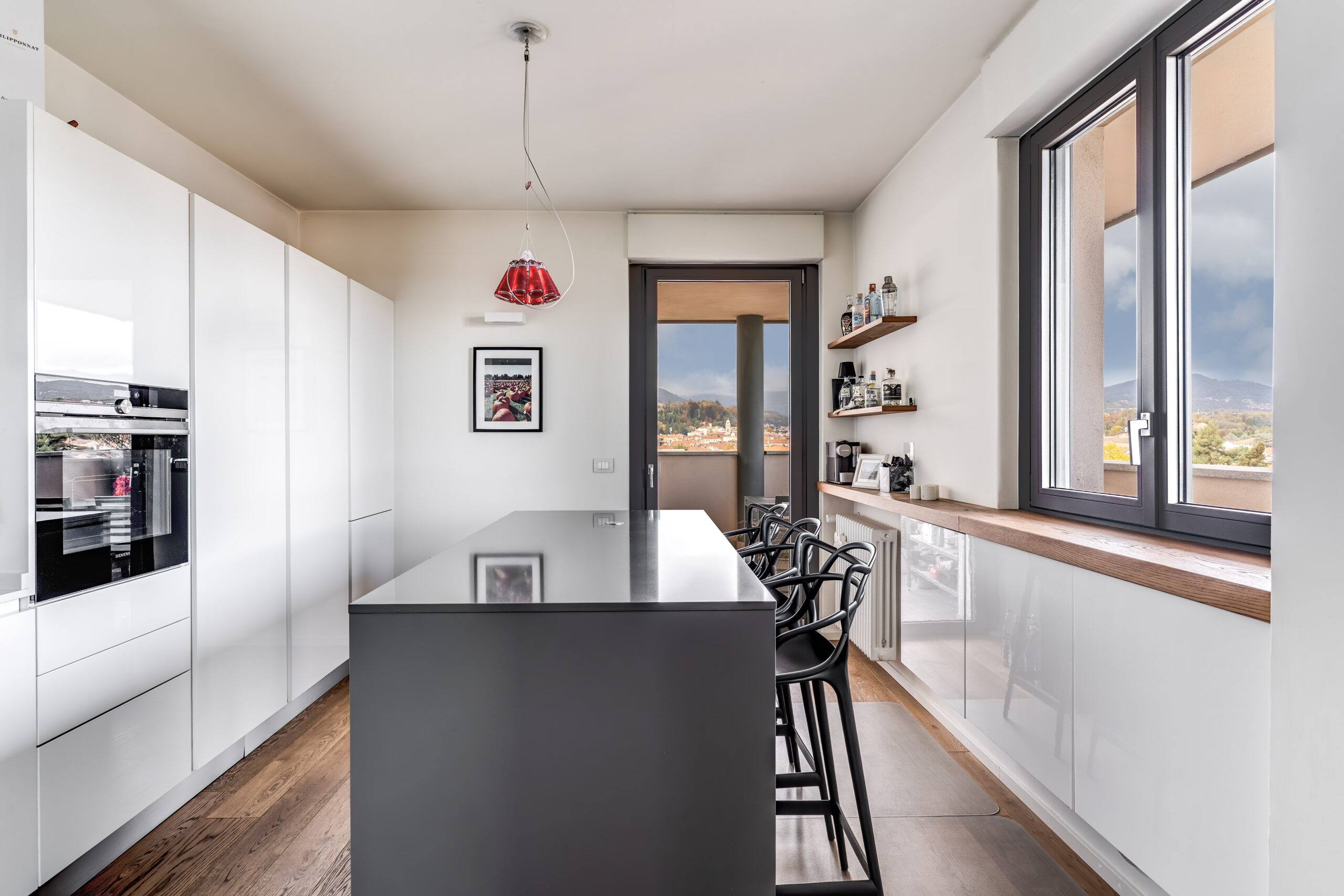 La cucina moderna dialoga armoniosamente con le linee essenziali e le finiture degli infissi Prolux Evolution di Oknoplast, creando un risultato esteticamente raffinato