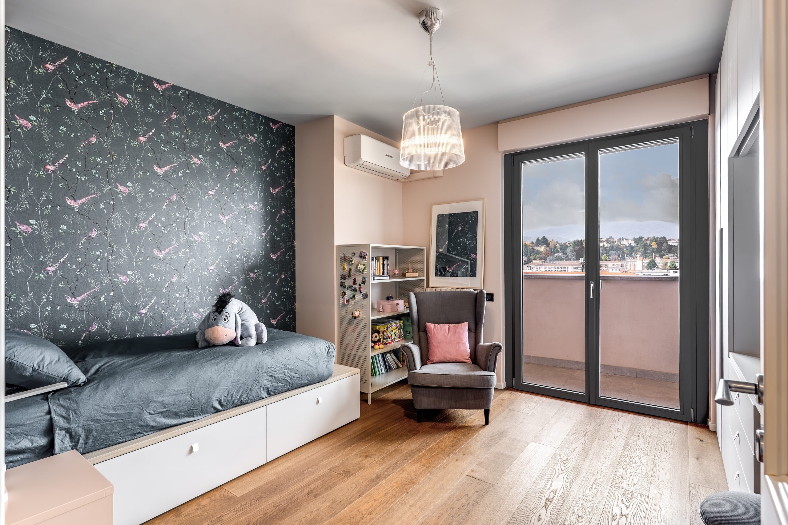 Anche la finitura grigio quarzo soft scelta ha contribuito a creare un contrasto elegante con i pavimenti in legno, le pareti chiare e gli arredi dai toni neutri, enfatizzando il disegno architettonico delle finestre senza appesantire l’insieme.