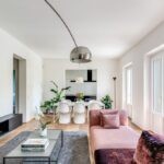 Gli spazi interni sono stati ridisegnati per valorizzare le dimensioni degli ambienti e per trasmettere un senso di piacevole accoglienza. A tal proposito, il salotto è direttamente connesso alla zona pranzo creando un unico grande ambiente in cui ogni elemento convive in perfetta armonia. Anche in questo caso prevale il bianco e l’unico tocco di colore, che diventa il focus della stanza, è costituito dall’ampio divano componibile, nelle tonalità rosa e viola, che dona dinamicità e movimento.